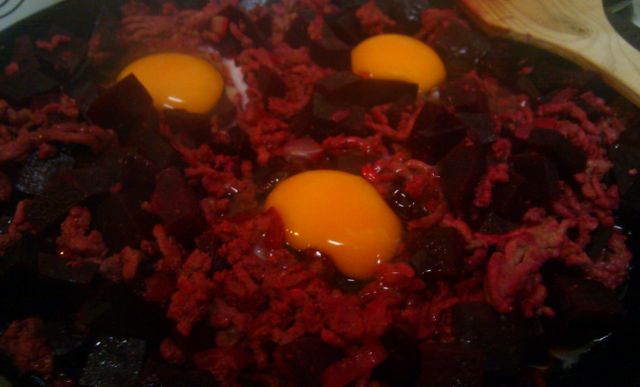 Puolikas hienonnettu sipuli ja 400 g jauhelihaa ruskistettiin pannulla. Sulatetut punajuurikuutiot lisättiin kuumenemaan. Mausteeksi suolaa ja reilusti pippuria myllystä. Kuivattua persiljaa ripoteltiin mukaan. Kun punajuuret olivat kuumuneet kauttaltaan, seokseen kaivettiin muutama kuoppa kananmunaa varten. Tässä vaiheessa levystä katkaistiin virta ja kananmunat saivat hyytyä osittain. Ruokaillessa kananmunan ”silmän” rikottuaan sai herkullisen kastikkeen tälle energiapitoiselle ruualle.