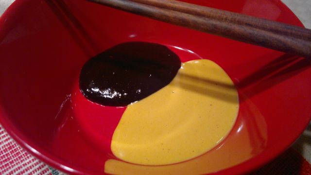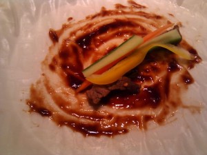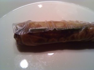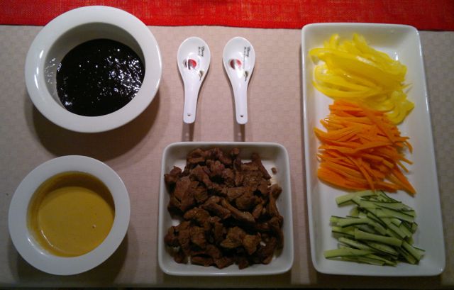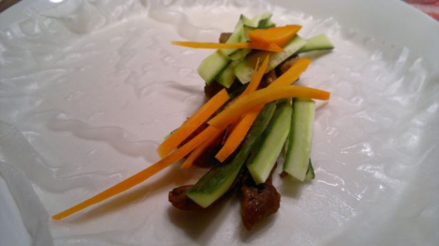 Koska ankat oli jo syöty, ruskistettiin ja hauduteltiin naudanlihasuikaleita täytteeksi. Liha maustettiin vain suolalla ja valkopippurilla. Kurkkua, paprikaa ja porkkanaa leikattiin ohuiksi tikuiksi. Kiinalaista Hoisin-kastiketta ostettiin ohjeen mukaan dipiksi. Dippinä toimi itsetehdystä majoneesista japanilaisella wasabilla ja soijalla sekä pippurirouheella maustettu kastike.