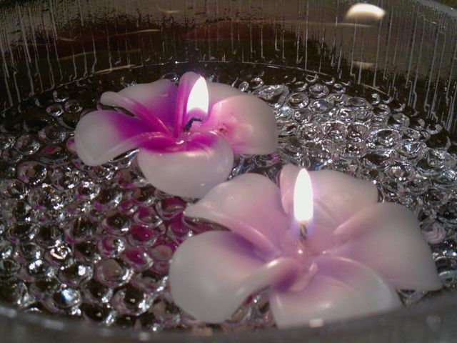 Lautasliinat taiteltiin häthätää löydetyn ohjeen mukaan ja pujotettiin kuohuviinilaseihin. Thaimaalaiset kelluvat kynttilät olivat kauniita tunnelman tuojia.