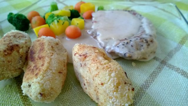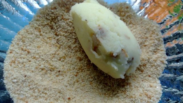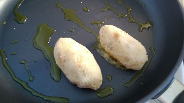 Muusista pyöriteltiin kahdella lusikalla ensin munia, jotka kieriteltiin korppujauhoissa ja muotoiltiin vielä sormin. Paistaminen öljytilkassa vaati helliä otteita, mutta muotoa pystyi korjaamaan vielä käännettäessäkin. Kuorukat odottivat ruokailijoita uunissa.